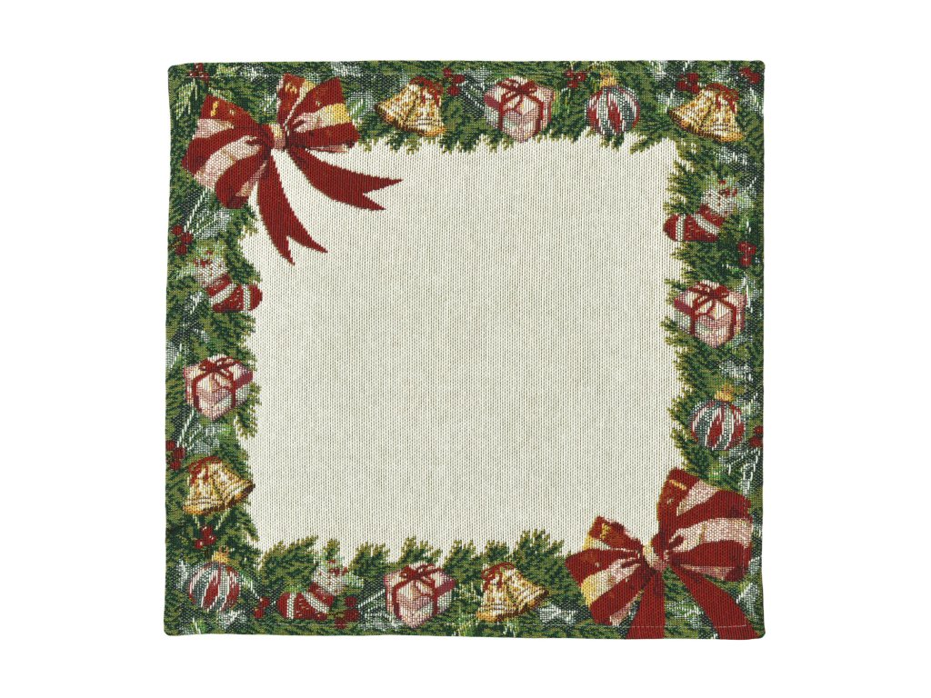 Gobelínové prestierania s klasickým jedľovým okrajom, mašľou a vianočnými ozdobami na advent a Vianoce.