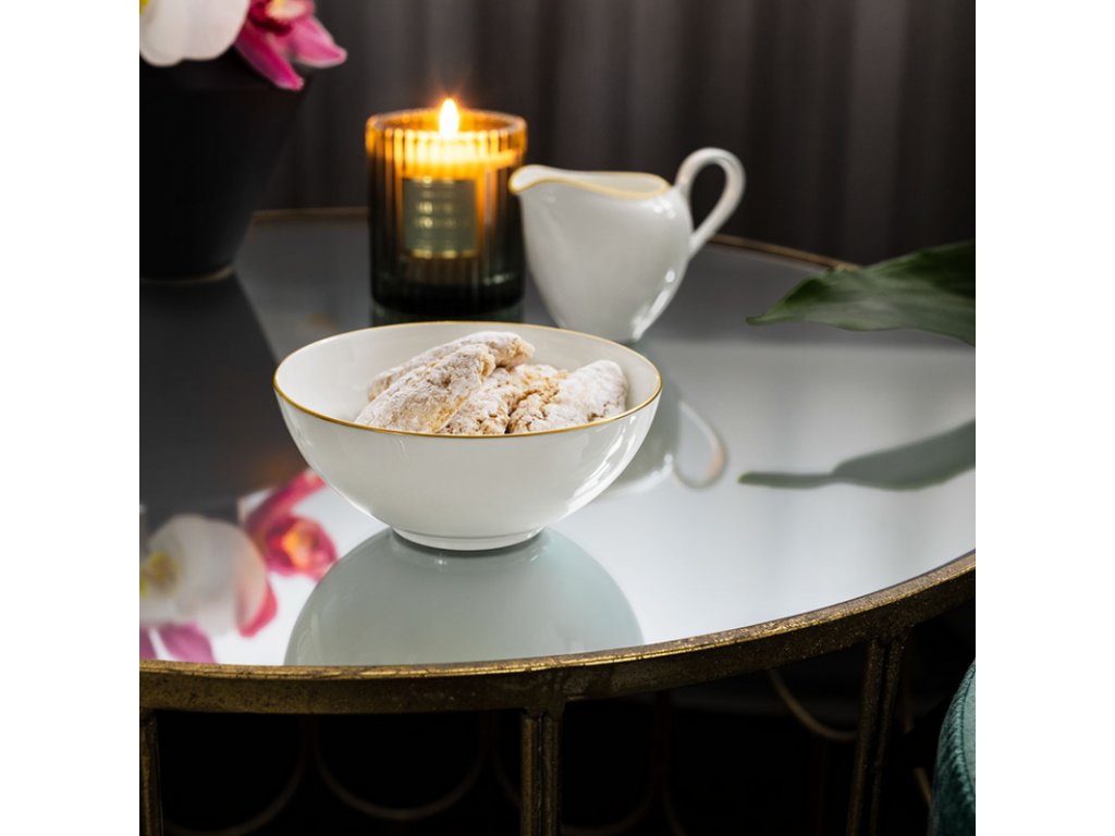 Kolekcia Anmut Gold obsahuje ručne maľované ozdobné línie vyrobené jemným zlatom na elegantnom bielom, vysokokvalitnom porceláne. Je to práve súhra prémiového kostného porcelánu a pravého zlata, ktorá dáva kolekcii zmysel pre štýl a triedu. Ideálne pre každého, kto má rád kvalitu a eleganciu. Táto miska je vašou odmenou za čakanie na dezert a bude vás dlho tešiť svojim brilantným vzorom vďaka technológii "Inglaze Gold". Urobte svoj stôl krajším s nadčasovým šarmom jemného zlata.